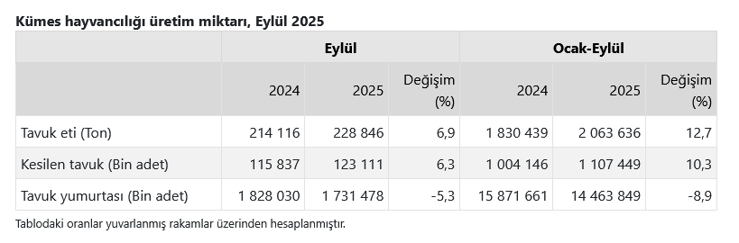 Ocak-Eylül döneminde bir önceki yılın aynı dönemine göre, tavuk yumurtası üretimi yüzde 8,9 geriledi, kesilen tavuk sayısı yüzde 10,3 yükseldi, tavuk eti üretimi yüzde 12,7 yükseldi.
