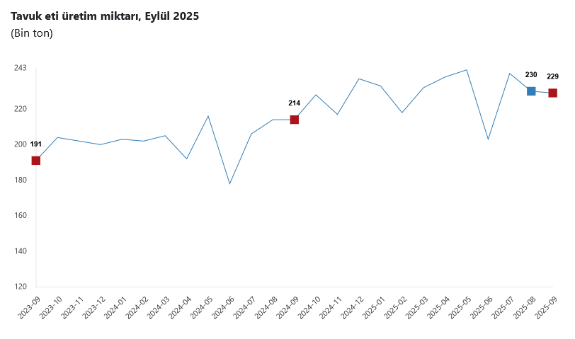 Bir önceki ay 229 bin 965 ton olan tavuk eti üretimi Eylül ayında yüzde 0,5 azalışla 228 bin 846 tona geriledi.