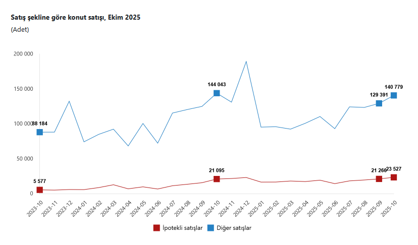Türkiye genelinde diğer konut satışları Ekim ayında bir önceki yılın aynı ayına göre yüzde 2,3 oranında azalarak 140 bin 779 oldu. Toplam konut satışları içinde diğer satışların payı yüzde 85,7 olarak gerçekleşti. Ocak-Ekim döneminde gerçekleşen diğer konut satışları ise bir önceki yılın aynı dönemine göre yüzde 10,8 oranında artarak 1 milyon 107 bin 13 oldu.