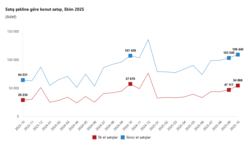 Türkiye genelinde ilk el konut satış sayısı Ekim ayında bir önceki yılın aynı ayına göre yüzde 4,9 oranında azalarak 54 bin 866 oldu. Toplam konut satışları içinde ilk el konut satışının payı yüzde 33,4 oldu. İlk el konut satışları Ocak-Ekim döneminde ise bir önceki yılın aynı dönemine göre yüzde 10,9 oranında artarak 397 bin 507 olarak gerçekleşti.