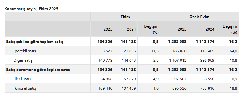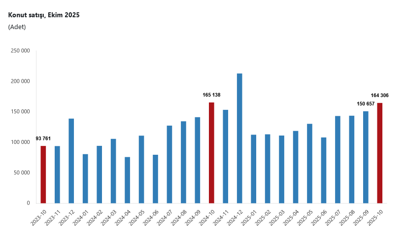 Türkiye İstatistik Kurumu’nun (TÜİK) verilerine göre, Türkiye genelinde konut satışları Ekim ayında bir önceki yılın aynı ayına göre yüzde 0,5 oranında azalarak 164 bin 306 oldu. Konut satış sayısının en fazla olduğu iller sırasıyla 26 bin 305 ile İstanbul, 14 bin 681 ile Ankara ve 8 bin 678 ile İzmir olurken, en az olduğu iller sırasıyla 86 ile Ardahan, 135 ile Bayburt ve 143 ile Tunceli olarak gerçekleşti.