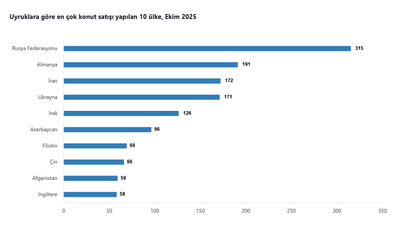 Ekim ayında ülke uyruklarına göre en fazla konut satışı sırasıyla 315 ile Rusya Federasyonu, 191 ile Almanya ve 172 ile İran vatandaşlarına yapıldı.