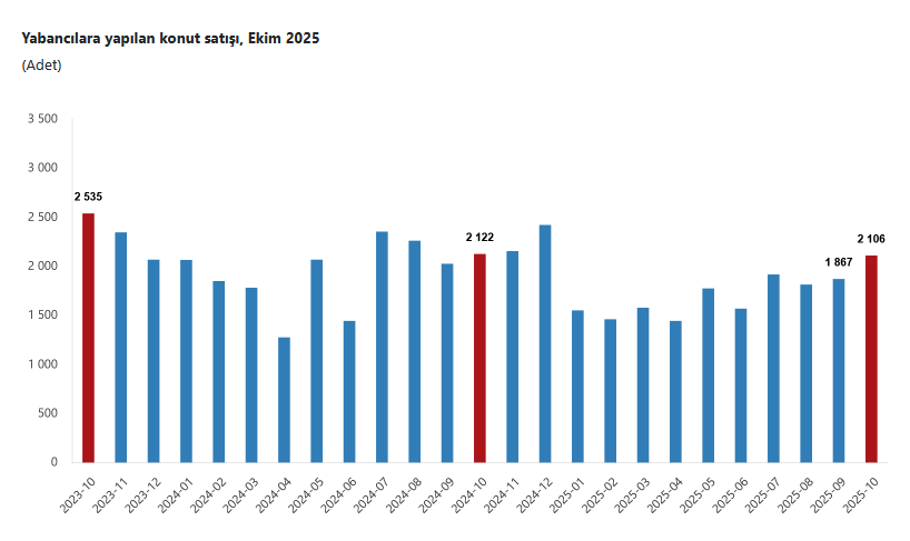 Yabancılara yapılan konut satışları Ekim ayında bir önceki yılın aynı ayına göre yüzde 0,8 oranında azalarak 2 bin 106 oldu. Ekim ayında toplam konut satışları içinde yabancılara yapılan konut satışının payı yüzde 1,3 olarak gerçekleşti. Yabancılara yapılan konut satış sayısının en fazla olduğu iller sırasıyla 729 ile Antalya, 725 ile İstanbul ve 192 ile Mersin oldu.
